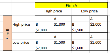If Firm B chooses High price, what should Firm A choose? Low price, since it makes a profit of $2,000 compared with $1,800 otherwise.